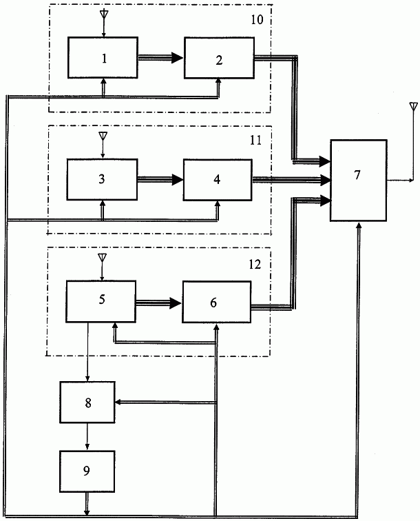 Станция принимает сигналы передатчиков ФРНС, ИФРНС и НИСЗ СРНС, поступающие с трасс, проходящих через и над контролируемым сейсмоопасным районом. Эти сигналы принимаются и обрабатываются соответственно в каналах 10, 11, 12 с помощью модулей 1, 3, 5 и пороговых блоков 2, 4, 6, причем в модулях 1, 3, 5 измеряются псевдодальности до соответствующих передатчиков ФРНС, ИФРНС и НИСЗ СРНС, а в пороговых блоках 2, 4, 6 фиксируются аномальные отклонения измеренных псевдодальностей от пороговых значений, идентифицируемые как предвестники землетрясения. Обработка принимаемых сигналов в каналах 10, 11, 12 осуществляется аналогично общеизвестной обработке сигналов в контрольных станциях ФРНС, ИФРНС и СРНС с той лишь разницей, что в пороговых блоках 2, 4, 6 на основе сравнения с пороговыми значениями формируются данные об аномальных отклонениях, идентифицируемых как предвестники землетрясения (а не дифференциальные поправки, фиксирующие все возникающие отклонения).