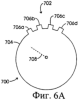 Как показано на фиг.6А-6Е, для создания фасеточного поворотного элемента для любого конкретного варианта выполнения дисплея могут использоваться разные модификации несущей части и фасеточной поверхностной части. На фиг.6А-6Е несущая часть и поверхностная часть обозначены в целом позициями 700 и 702 соответственно. На фиг.6А изображена по существу плоская круглая пластина 704, имеющая фасетки в виде опор 706a-706d, которые выступают из ее внешнего края. Дифракционная решетка, например из фоторезиста (голографическая дифракционная решетка), расположена на внешнем конце каждой опоры 706a-706d. При использовании круглой пластины, например такой, как обозначенная позицией 704, наиболее естественно расположить поворотную ось так, чтобы она проходила через центр 708 пластины. Альтернативно, в качестве несущей части может использоваться лишь часть круга, как показано на фиг.6В, где фасеточная поверхностная часть проходит по внешнему периметру. При использовании такой менее массивной конструкции фасеточный поворотный элемент может поворачиваться быстрее при меньших затратах энергии, необходимых для того, чтобы начать и закончить поворот от одной дифракционной решетки до другой. В этой конфигурации наиболее эффективным местом для расположения оси вращения является центр тяжести. Для сокращения времени поворота в желаемое положение наблюдения и для повышения эффективности работы путем уменьшением массы фасеточного поворотного элемента специалисты в данной области техники могут использовать множество конструкций. Аналогично, количество опор, или количество дифракционных решеток, расположенных на каждой опоре, может меняться в соответствии с назначением дисплея.
