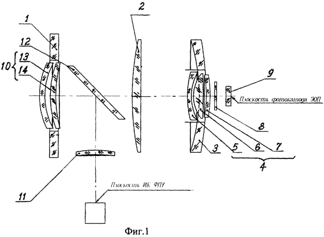 Линзовый ТП канал выполнен в виде двух компонентов 10 и 11, разнесенных вдоль оптической оси на значительное расстояние, между которыми установлено поворотное зеркало 12. Компонент 10 линзового ТП канала установлен в отверстии компонента 1 зеркально-линзового канала, поворотное зеркало 12 установлено между компонентами 1 и 2 зеркально-линзового канала. В первом исполнении (фиг.1) компонент 10 содержит два мениска 13 и 14, второй компонент 11 выполнен в виде одиночного мениска, при этом все мениски ориентированы вогнутыми поверхностями к плоскости изображений и имеют место вышеприведенные соотношения (2).