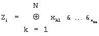 где символами и & обозначены соответственно операции “ИСКЛЮЧАЮЩЕЕ ИЛИ” и “И”; m=2i-1; хk1,… ,хkm {x1,… ,x8} (1 k1<… 8); есть количество неповторяющихся конъюнкций хk1 &… & хkm, определяемое как число сочетаний из 8 по m. В частности, имеем Z1=х1 … х8,![]()