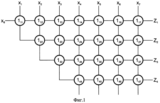 Идентификатор числа единичных сигналов содержит двадцать две ячейки 111,… ,147. Каждая ячейка содержит элемент “И” 2, элемент “исключающее ИЛИ” 3, первый и второй входы 41 и 42, первый и второй выходы 51 и 52, причем вход 41, вход 42 и выходы 51, 52 образованы соответственно объединенными первыми, объединенными вторыми входами элементов 2, 3 и выходом элемента 2, выходом элемента 3. Все ячейки сгруппированы в матрицу из четырех строк и семи столбцов так, что i-ая строка и j-ый столбец содержат соответственно 8-i и j ячеек, в i-ой строке выход 52 каждой предыдущей ячейки и выход 52 ячейки 1i7 соединены соответственно с входом 42 последующей ячейки и i-ым выходом идентификатора числа единичных сигналов, а в j-ом столбце выход 51 каждой предыдущей ячейки и вход 41 ячейки 11j соединены соответственно с входом 41 последующей ячейки и j-ым входом идентификатора числа единичных сигналов, выход 51 ячейки 1ij подключен к входу 42 ячейки 1(i+1)(j+1), а вход 42 ячейки 111 – к восьмому входу идентификатора числа единичных сигналов.