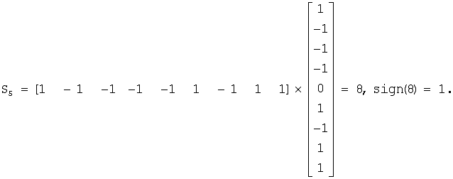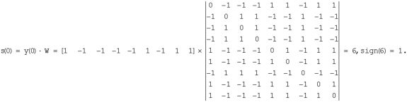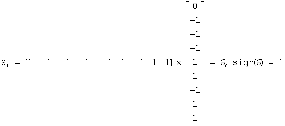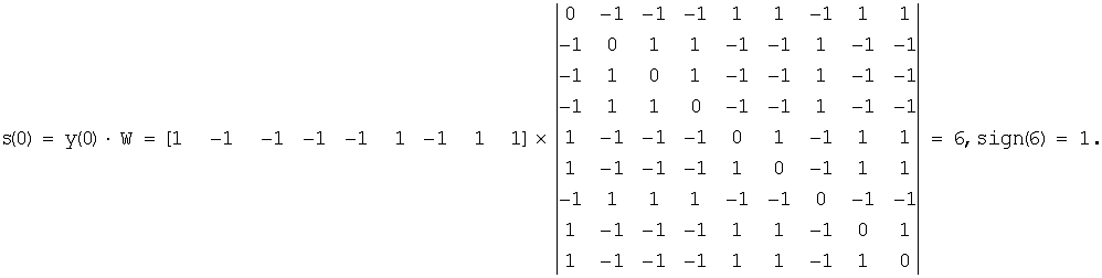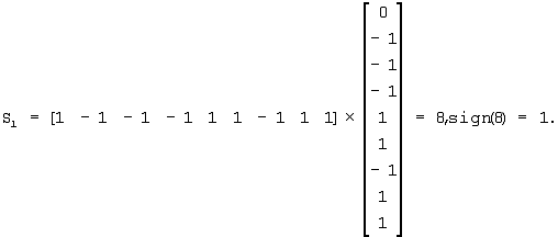 Во 2,3 и 4 тактах s(1)=s(2)=s(3)=-6, a sign(-6)=-1, т.е. состояние элементов не изменилось. В 5-м такте s(4)=8, a sign(8)=1, т.е. 5-й элемент изменил свое состояние с -1 на 1. Теперь Y=[1 -1 -1 -1 1 1 -1 1 1]. В 6, 7, 8 тактах s(5)=8, s(6)=-8, s(7)=8 и s(8)=8, sign(s(8))=1, sign(s(-8))=-1. После 5-го такта состояние элементов не изменялось. В результате чего произошло исправление 5-го разряда.
