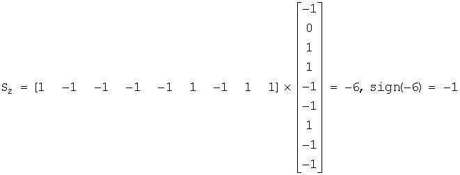 Элемент 2 также находится в том же состоянии. Далее находим s3=-6, sign(-6)=-1, s4=-6, sign(-6)=-1. Теперь проверим