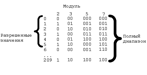 Например, в избыточной СОК, состоящей из 4-х модулей p1=2, р2=3, p3=5, p4=7, входной набор будет состоять из 9-ти двоичных разрядов. Если взять модули р3 и р4 избыточными, тогда рабочий диапазон будет равен р1· р2=6, а области разрешенных и запрещенных значений в двоичном коде можно представить в виде