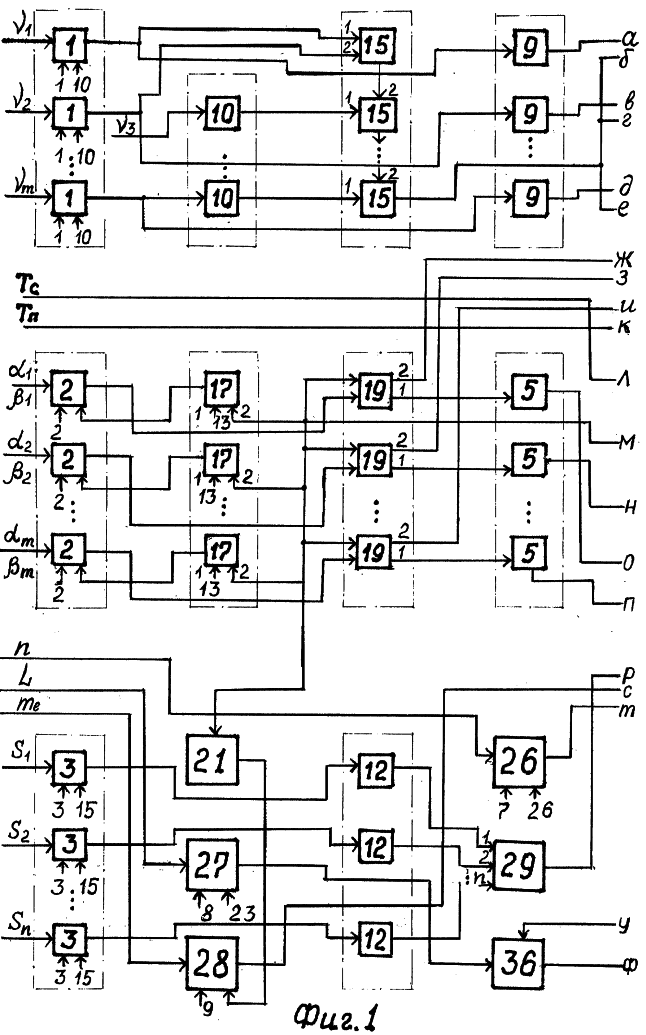 По сигналу с десятого выхода распределителя 80 импульсов на входы считывания первой группы 1 входных регистров величины j подаются на входы шестой группы 10 ЭЗ, на входы первого сумматора первой группы 15 сумматоров ( 1 и 2), а также на входы пятой группы 9 ЭЗ. Наличие групп 10, 15 и 9 обеспечивает одновременное поступление на входы делимого и делителя каждого блока деления первой группы 37 блоков деления величин j и . Следовательно, с группы 37 значения ОКЭ Cj, определяемые по формуле (1), направляются на входы первой группы 39 индикации (для возможности наглядного сравнения) и на информационные входы группы 41 регистров. Управляющий сигнал на входы записи группы 41 подается с одиннадцатого выхода распределителя 80 импульсов.