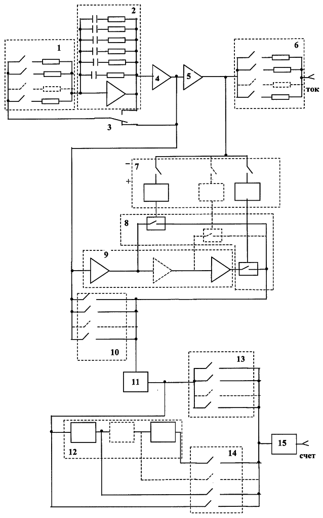 Группа 1 входных резисторов с коммутирующими ключами подключена с одной стороны ко входу измерительного усилителя 2, а с другой – к выходу коммутатора 3 выбора знака реактивности. Первый вход коммутатора 3 подключен к выходу измерительного усилителя 2, охваченного обратной связью, состоящей из шести RC цепочек. Выход усилителя 2 соединен со входом инвертирующего усилителя 4, а второй вход коммутатора 3 подключен к точке соединения выхода инвертирующего усилителя 4, входа высоковольтного усилителя 5, входа первого декадного усилителя группы 9 декадных усилителей и входа группы 10 ключей выбора режима. Группа 7 пороговых устройств с ключами выбора порога со стороны ключей соединена с выходом высоковольтного усилителя 5 и со входом группы 6 цепочек из резисторов формирования выходного тока и ключей выбора величины тока, выход которой является токовым выходом имитатора. Группа 7 пороговых устройств с ключами выбора порога со стороны пороговых устройств подключена к соответствующим управляющим входам электронных коммутаторов группы 8 электронных коммутаторов, входы которых подключены к соответствующим выходам декадных усилителей группы 9 декадных усилителей, а выходы объединены с выходом группы 10 ключей выбора режима и входом преобразователя 11 напряжение-частота. Выходы первой группы 13 и второй группы 14 ключей выбора частоты подключены ко входу формирователя 15 импульсов тока камеры деления, выход которого является частотным выходом имитатора. Каждый из входов второй группы 14 ключей выбора частоты подключен ко входу одного из декадных делителей частоты группы 12 декадных делителей частоты, кроме последнего в этой группе ключей, который подключен к выходу последнего декадного делителя частоты. Вход первой группы 13 ключей выбора частоты соединен с выходом преобразователя 11 напряжение-частота и со входом первого декадного усилителя группы 12 декадных усилителей.