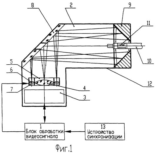 Размер отражающих поверхностей зеркал 8 и 9 должен обеспечивать получение полной проекции кода 11 на фоточувствительной площадке многоэлементного матричного фотоприемника 3. Элементы оптического блока 2 установлены в корпусе 12, имеющем отверстия со стороны конического зеркала 9 и плоского зеркала 8, предназначенные, соответственно, для ввода и вывода изделия 10. Многоэлементный матричный фотоприемник 3 соединен с входом блока обработки видеосигнала 1. Осветитель 5 соединен с управляющим выходом блока обработки видеосигнала 1, а устройство синхронизации 13 соединено с управляющим входом блока обработки видеосигнала 1.