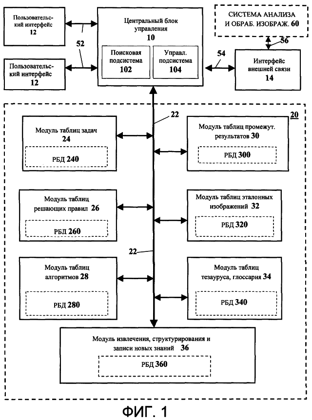 Подсистема 20 включает в себя подключенные к общей информационно-управляющей магистрали 22: модуль 24 задач, модуль 26 поддержки процессов планирования, управления и принятия решений, модуль 28 алгоритмов, модуль 30 промежуточных результатов решения задач, модуль 32 эталонных и тестовых изображений, модуль 34 тезауруса, глоссария, библиографии и справочника, и модуль 36 извлечения, структурирования и записи новых знаний. К общей информационно-управляющей магистрали 22 подключен первый вход-выход центральной подсистемы 10 управления, второй вход-выход 52 которой связан с пользовательским интерфейсом 12. Третий вход-выход 54 связан с внутренним входом-выходом интерфейса 14 внешней связи, внешний вход-выход 56 которого является входом-выходом базы знаний по анализу и распознаванию изображений. Этот вход-выход 56 интерфейса 14 предназначен для подключения к системам анализа и обработки изображений и осуществляет обмен данными, в частности может быть подключен к системе “Черный квадрат” по заявке RU 2003107587, 20.03.2003 или патенту RU 30206 U1, 20.03.2003.