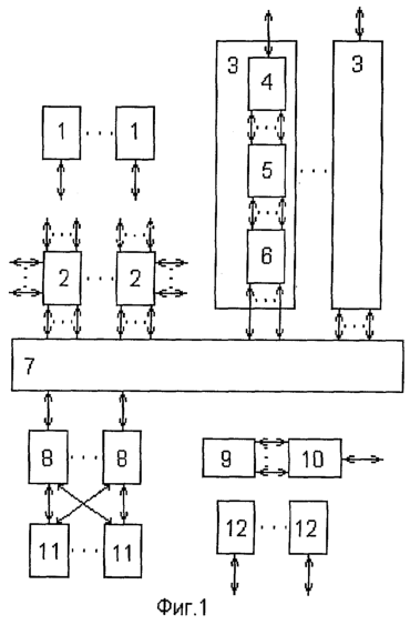 После включения питания на группе мультиплексоров 8 каждый мультиплексор переходит на опрос наличия признака ведущего в своих внутренних схемах. Тот мультиплексор 8, который обнаружил в своих схемах этот признак, считает себя ведущим. После этого он через соответствующие линии связи входит в связь с опрашивающими его ПЦН 11, получает от них уникальные адреса для всех концентраторов 2 и 3. Одновременно с адресами ведущий мультиплексор 8 получает от ПЦН 11 оперативную информацию, предназначенную для загрузки в каждый концентратор 2 и 3, и начинает циклический опрос через локальную сеть связи 7 состояний всех подключенных к ней мультиплексоров 8 и концентраторов 2 и 3, прием от них информационных сообщений и передачу обратно данных и команд. Полученная ведущим мультиплексором 8 информация от концентраторов 2 и 3 через группу входов/выходов и линии связи передается по назначению на соответствующий ПЦН 11. Опрос концентраторов 2 и 3 производится по уникальным адресам в локальной сети 7, которые получены ведомым мультиплексором 8 от ПЦН 11. Ведомый мультиплексор 8 только прослушивает работу ведущего в локальной сети связи 7. По локальной сети связи 7 ведущий мультиплексор 8 передает все изменения в своих данных на ведомые мультиплексоры 8 и контролирует идентичность их и своих данных. Если ведущий мультиплексор 8 прекращает опрос в локальной сети связи 7 на определенный промежуток времени, то ведомый мультиплексор 8 переключается в режим ведущего с выполнением его функций.