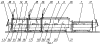 Чистка первых пяти зон 13, 14, 15, 16, 17 секции 5 нагревания от наростов цинксодержащих соединений осуществлена без снятия печи агрегата 4 спекания с нагрева с использованием технологического устройства 21 (фиг.4), выполненного в виде длинномерного стержня 22 со скребками 23 в верхней и боковых частях на торце, вводимом со стороны узла загрузки 24 на всю длину зон 13, 14, 15, 16, 17 нагрева с регулируемой по высоте опорой 25 на выдвижной поддон 26, перекрывающий зону падения цинксодержащих наростов со свода 27 и боковых стенок 28 тоннеля печи. В средней части длинномерного стержня 22 размещены опорные салазки 29 из полусферических ободов, опираемых на футеровку 30 по бокам транспортного средства 31 (фиг.2) перемещения лодочек 8 из молибдена по тоннелю через зоны печи, а другой торец длинномерного стержня 22 снабжен вне печи приводом продольного возвратно-поступательного и вверх-вниз его перемещения (не показан) – показано стрелками направление перемещения (фиг.4, 7). Для очистки щелевого пространства 32 между транспортным средством 31 перемещения лодочек 8 из молибдена по тоннелю через зоны печи и боковой футеровкой 30 тоннеля печи использовано второе технологическое устройство – длинномерный стержень 33 со скребком 34 на торце с толщиной “Н”, равной 1/2 расстояния “H1” между боковой футеровкой 30 тоннеля печи и транспортным средством 31 перемещения по тоннелю печи лодочек 8 из молибдена через зоны печи. В средней части второй длинномерный стержень 33 снабжен регулируемым по высоте упором 35 с опорой на поверхность транспортного средства 31 перемещения лодочек 8 из молибдена по тоннелю печи, а с другого конца приводом возвратно-поступательного перемещения (не показан). Каждая зона печи агрегата 4 спекания изолирована от других зон тепловыми барьерами, называемыми экранами 36. Выгрузка лодочек 8 из молибдена со спеченными таблетками осуществлена через узел выгрузки 37, а отходящие газы через трубы дожигания 38 выводятся из процесса.