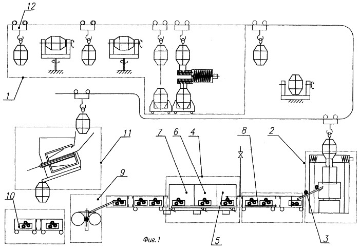 – агрегат 4 спекания таблеток в виде печи тоннельного типа с секциями нагревания 5, спекания 6 в восстановительной среде и охлаждения 7 с продвижением лодочек 8 с таблетками через секции печи;
