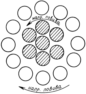 1. Провод неизолированный сталемедный, состоящий из девятнадцати проволок, расположенных по схеме: одна-шесть-двенадцать (1-6-12), начиная от оси провода, с внутренним и наружным повивом проволоки, скрутка повивов произведена в противоположные стороны, причем наружный повив имеет правое направление скрутки, отличающийся тем, что провод состоит из семи медных и двенадцати стальных проволок, при этом первая и шесть последующих проволок являются медными, остальные двенадцать проволок – стальными, при этом медные проволоки имеют шаг скрутки повива 100-150 мм, а стальные проволоки – 150-200 мм.