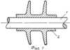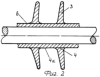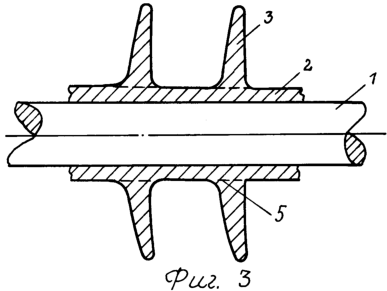 b) многоступенчатый процесс-изготовления (см. фиг.2). В этом случае кожух 6 отливается или экструдируется на цельный или полый корпус, отдельно от него готовятся юбки 3, как правило, путем литья под давлением или прессованием, которые затем надеваются на ядро и крепятся на нем с помощью какого-либо адгезива.