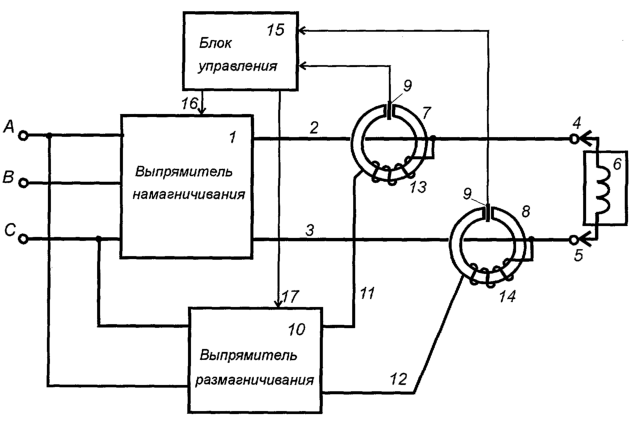 В случае превышения допустимой величины тока в цепи 2 или 3 при работе выпрямителя намагничивания 1, что свидетельствует о возникновении аварийного режима короткого замыкания в катушке грузового электромагнита 6 или в ее кабеле питания, блок управления 15 прекращает подачу сигналов управления, т.е. отключает выпрямитель. Ток утечки электромагнита контролируют во время работы выпрямителя размагничивания 10, сравнивая сигналы датчиков Холла 9. Поскольку датчики тока в это время имеют большую чувствительность, чем при намагничивании, определение тока утечки существенно упрощается. В случае превышения током утечки заданного значения блок управления регистрирует возникновение аварийного режима и не допускает дальнейшей работы выпрямителя намагничивания.