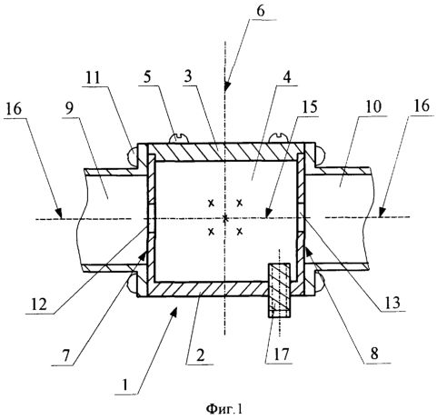 Резьбовой стержень 17 служит для изменения объема полости резонатора в процессе настройки резонансной частоты путем перемещения (ввертывания) внутрь полости резонатора. Предел перемещения резьбового стержня 17 внутрь полости резонатора выбирается в пределах расстояния 1, соответствующего расстоянию между внутренней поверхностью торцевой стенки 2 и нижней кромкой отверстия связи 13 (фиг.2). Для фиксации положения резьбового стержня 17 после настройки резонансной частоты может применяться фиксирующая наружная гайка (на фиг.1-3 не показана).