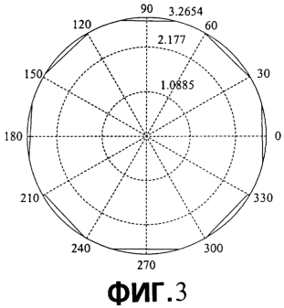 где r – радиус круговой антенной решетки, – рабочая длина волны. На фиг.3 изображена диаграмма направленности мощности при формировании круговой диаграммы направленности для нормальной круглой антенной решетки с 8 антеннами. Квадраты чисел 1,0885, 2,177, 3,2654, показанные на фиг.3, представляют уровни мощности.