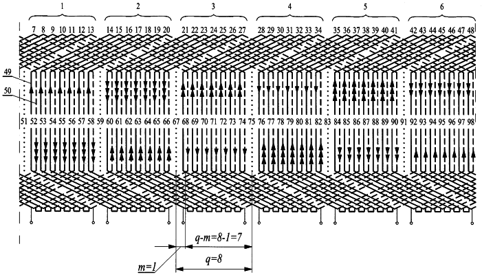 Сущность изобретения поясняется чертежом, где изображена симметричная трехфазная двухполюсная двухслойная обмотка, например, для q=8 и m=1, состоящая из катушечных групп 1… 6, сформированных из катушек 7… 48 по q-m=8-1=7 катушек каждая, уложенная в два слоя 49, 50 в равномерно распределенных вдоль рабочего воздушного зазора 6q пазах 51… 98 с пропуском 6m=6 пазов 51, 59, 67, 75, 83, 91 между соседними катушечными группами 1… 6, при этом левые активные стороны катушек занимают первый слой 49 так, что указанные стороны катушек 14… 20 2-ой группы уложены в пазах 52… 58, катушек 21… 27 3-ей группы – в пазы 60… 66, катушек 28… 34 4-ой группы – в пазы 68… 74, катушек 35… 41 5-ой группы – в пазы 76… 82, катушек 42… 48 6-ой группы – в пазы 84… 90, катушек 7… 13 1-ой группы – в пазы 92… 98, а правые смещены на величину шага у=2q=16 и занимают второй слой 50.
