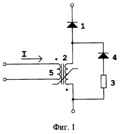 Схема на фиг.1 содержит включенный последовательно с диодом 1 дроссель насыщения 2, зашунтированный цепью из последовательно соединенных резистора 3 и второго диода 4, включенного согласно диоду 1, дополнительную обмотку 5 с током подмагничивания I, введенную на сердечнике дросселя насыщения 2.