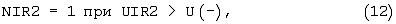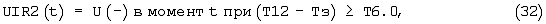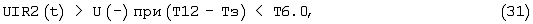 С началом каждого фронта сигнала OХ8=IХ12 в течение времени Тз (28) по напряжению U8 En происходит заряд конденсаторов 19 и 20 через сопротивление (R24+Rd) до напряжений UC19 (29) и UC20 (30) соответственно. Затем с началом каждого спада сигнала OХ8 в течение времени Т12.0 при U8 0 В происходит разряд конденсатора 19 примерно до 0 В, а разряд конденсатора 20 от начального напряжения (30) происходит в течение времени (Т12-Тз), т.е. в течение большей части периода Т12 частоты следования импульсов OХ8=IХ12. Изменение же напряжения UIR2 происходит непрерывно со слежением за изменениями напряжения UC20>U(-) в течение как Тз, так и (Т12-Тз). В этой связи в данном режиме текущее значение напряжения UIR2(t) в зависимости от длительности (Т12-Тз) воспринимается по входам повторителем 6 при выполнении условия (31) обнаружения импульсов OХ8=IХ12 как цифровой сигнал NIR2=1 (т.e. UIR2(t)>U(-)), а если выполняется условие (32) обнаружения пропуска (или “зависания”) импульсов OХ8=IХ12, то в некоторый момент времени напряжение UIR2(t) уменьшается до порогового напряжения U(-), и через конденсатор 5 и резистор 2 замыкается петля положительной обратной связи, сигнал NOX6 переключается из “1” в “0”, и устройство переходит на время Т6.1 (18) в единичное состояние генерации (ЕСГ)