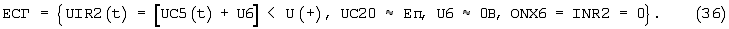 В течение времени Т6.1 напряжение UIR2(t) непрерывно увеличивается за счет заряда конденсатора С5 от напряжения (UC20-U6) Eп через резистор 1, и при t=T6.1 напряжение UIR2(t) становится равным U(+). Дальнейшее увеличение напряжения UIR2(t) по цепи положительной обратной связи через конденсатор 5 и резистор 2 вызывает переключение выходного сигнала ONX6 из “0” в “1” и возврат устройства в НДСОИ (35). Дальнейшее функционирование устройства определится поведением сигнала 0Х8=IХ12 как функции времени, а при “зависании” сигнала IХ12 (т.е. при неизменном во времени сигнале IХ12=0 или IХ12=1) устройство переходит в режим автогенератора. Режим автогенератора осуществляется как чередование по кольцу описанных процессов формирования NOX6=0 в течение Т6.1 и NOX6=1 в течение Т6.0, причем