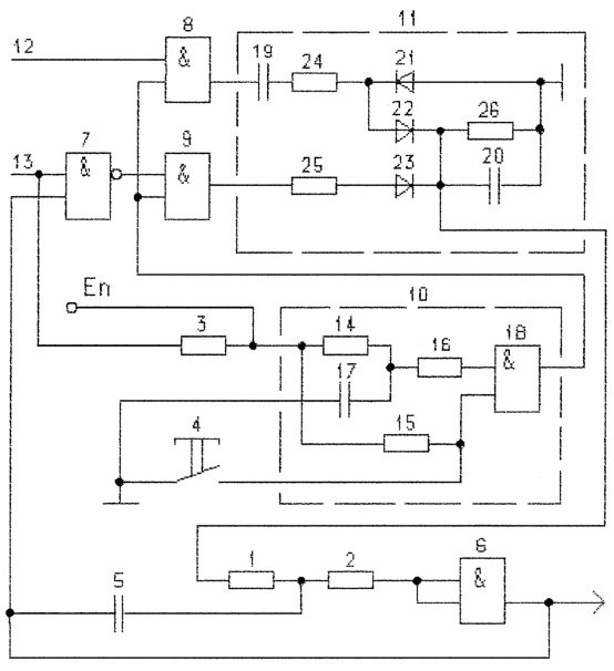 Возможный вариант объединителя 10 сигналов по включению питания и от кнопки содержит резисторы 14-16, конденсатор 17, элемент 18 И технологии КМОП, первый вход, соединенный с первыми выводами резисторов 14 и 15, второй вход, соединенный с первым выводом конденсатора 17, второй вывод которого соединен с вторым выводом резистора 14 и первым выводом резистора 16, второй вывод которого соединен с первым входом элемента 18 И, третий вход, соединенный с вторым выводом резистора 15 и вторым входом элемента 18 И, и выход, являющийся выходом элемента 18 И.