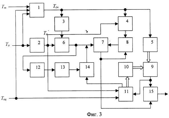 При поступлении импульса внешнего запуска Т0 логическое устройство 1 начинает пропускать импульсы опорной тактовой последовательности Тm, начиная с импульса, следующего за импульсом внешнего запуска T0 (см фиг.4). Эти импульсы поступают на входы селектора первого импульса 3, второго логического устройства 4 и счетчика импульсов 5. Импульс, прошедший через селектор первого импульса 3, запускает задающий ГЛИН 6, а воспроизводящий ГЛИН 8 в это время не работает, т.к. второе логическое устройство 4 не пропускает первый импульс, прошедший через первое логическое устройство 1, поскольку открывается лишь после прихода задержанного импульса внешнего запуска Т’0. Схема задержки 2 импульса внешнего запуска задерживает этот импульс на интервал времени, равный периоду следования тактовых импульсов Тm. Генераторы линейно изменяющегося напряжения ГЛИН 6 и ГЛИН 8 построены как интеграторы тока, задаваемого высокостабильными управляемыми генераторами тока. В момент прихода на второй управляющий вход задающего ГЛИН 6 задержанного импульса внешнего запуска Т’0 его генератор тока отключается и на выходе ГЛИН 6 сохраняется уровень напряжения, соответствующий моменту прихода задержанного импульса внешнего запуска Т’0. В воспроизводящем ГЛИН 8, который запускается лишь вторым и последующими тактовыми импульсами, прошедшими через логическое устройство 1, уровень выходного напряжения возрастает лишь до уровня напряжения, поддерживаемого на первом входе компаратора 7 (т.е. до уровня напряжения, сохраняемого на выходе задающего ГЛИН 6 после прохождения первого тактового импульса, прошедшего через логическое устройство 1). После достижения этого уровня напряжение на выходе ГЛИН 8 обнуляется, т.к. перепад напряжения на выходе компаратора 7 сбрасывает его, после чего компаратор возвращается в исходное состояние. Поскольку скорости нарастания линейно изменяющихся напряжений ГЛИН 6 и ГЛИН 8 одинаковы, то длительности их фронта нарастания t1 и t2 (см. фиг.4) тоже будут одинаковы. Короткие импульсы, формируемые на выходе компаратора 7 после прихода каждого очередного тактового импульса (начиная со второго), окажутся сдвинутыми относительно исходной тактовой последовательности импульсов на этот интервал времени t, равный сдвигу импульса внешнего запуска Т0 относительно предшествующего ему тактового импульса. Из этой сдвинутой последовательности импульсов затем и формируются все необходимые временные задержки, что и обеспечивает их фазовую привязку к импульсу внешнего запуска. Для этого эти импульсы поступают на один из входов формирователя 15 выходных синхроимпульсов.
