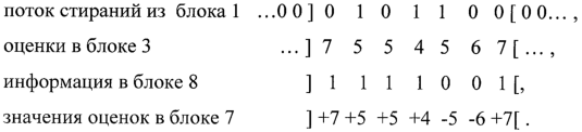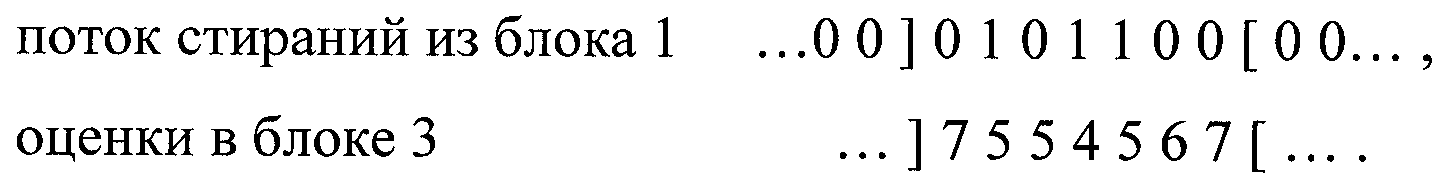 Блок восстановления стираний 4 определяет возможность физического восстановления комбинации избыточного систематического кода при конкретной конфигурации стираний. Работая в метрике Хэмминга, блок выбирает d-1 символов кодовой комбинации с наименьшими оценками надежности (здесь d – минимальное кодовое расстояние). Таким образом, в блоке 4 формируется вторичный поток стираний, основанный на показателях Fi. По результатам выбора осуществляется анализ возможности однозначного исправления стертых символов. В случае успешного исхода стирания исправляются в блоке исправления стираний 5, в противном случае по управляющему выходу блока 4 на второй вход блока коррекции 6 подается сигнал о получении дополнительной информации результатов обработки кодовой комбинации. Необходимость получения такой информации возникает в ситуации, когда на длине кодовой комбинации получается больше, чем d-1 оценок, имеющих минимальные показатели, и возникает ситуация неопределенности. Например, по полученной конфигурации оценок комбинации кода (7, 4, 3) необходимо выбрать только два символа для стирания. При этом оценка “4” однозначно указывает на самый ненадежный символ, а для стирания второго символа необходимо выбирать между трех символов с оценкой “5”. Среди символов с низкими показателями надежности наиболее вероятно появление ошибок. Для разрешения ситуации неопределенности используется информация из накопителя кодовой комбинации 8, блока оценок демодуляции 7 и блока коррекции 6.