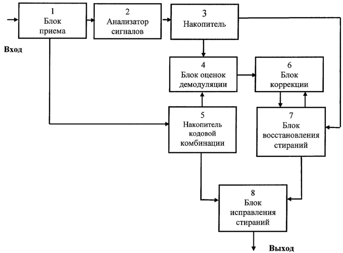 Устройство восстановления кодовой последовательности, содержащее блок приема, один выход которого через анализатор сигналов подключен к накопителю, один выход которого подключен к первому входу блока восстановления стираний, информационный выход которого подключен к одному из входов блока исправления стираний, отличающееся тем, что введены накопитель кодовой комбинации, блок оценок демодуляции и блок коррекции, выход которого подключен к второму входу блока восстановления стираний, управляющий выход которого подключен к второму входу блока коррекции, первый вход которого подключен к выходу блока оценок демодуляции, первый вход которого подключен к другому выходу накопителя, а второй вход подключен к второму выходу накопителя кодовой комбинации, вход которого подключен к другому выходу блока приема, а первый выход к другому входу блока исправления стираний.