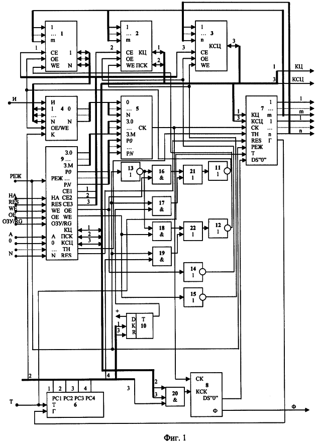 Устройство для цикловой синхронизации (фиг.1) содержит первое оперативное запоминающее устройство (ОЗУ) 1, второе ОЗУ 2, третье ОЗУ 3, регистр запоминания (РЗ) 4, дешифратор 5, распределитель 6, генераторное оборудование (ГО) 7, фазирующее устройство (ФУ) 8,устройство настройки и диагностики (УНД) 9, триггер 10, с первого по пятый инверторы 11, 12, 13, 14, 15, с первого по пятый элементы И 16, 17, 18, 19, 20, первый и второй элементы ИЛИ 21, 22, причем тактовый вход (вход Т) устройства для цикловой синхронизации (ЦС) соединен с соответствующими входами распределителя 6 и ГО 7, адресные выходы 1, …, m и 1, …, n которого являются соответствующими адресными выходами устройства для ЦС, адресные выходы 1, …, m ГО 7 также соединены с соответствующими адресными входами первого ОЗУ 1, входы/выходы 1, …, N которого соединены с соответствующими входами/выходами РЗ 4, информационный вход (вход И) которого является информационным входом устройства для ЦС, а выходы (выходы 0, …, N) соединены с соответствующими входами дешифратора 5, выход (выход СК) которого соединен с соответствующими входами ГО 7 и ФУ 8, выход нулевого состояния (выход DS”0″) которого соединен с соответствующим входом ГО 7, а выход наличия синхронизации (выход Ф) является выходом наличия синхронизации устройства для ЦС, выход (выход Г) генератора импульсов ГО 7 соединен с соответствующим входом распределителя 6, первый выход (выход РС1) и третий выход (выход РС3) которого соединены соответственно с тактовым входом (вход К) и входом установки в ноль (вход R) триггера 10, а второй выход (выход РС2) – с тактовым входом (вход К) РЗ 4, вход чтения/записи (вход OE/WE) которого соединен с выходом первого инвертора 11, информационный вход (вход D) триггера 10 соединен с шиной питания, выходы первого 11 и второго 12 инверторов соединены соответственно с входами чтения (вход ОЕ) и записи (вход WE) первого ОЗУ 1, адресные входы 1, …, m второго ОЗУ 2 соединены с соответствующими выходами ГО 7, адресные выходы 1, …, n которого соединены с соответствующими входами третьего ОЗУ 3, входы выбора (входы СЕ) первого 1, второго 2 и третьего 3 ОЗУ соединены с соответствующими выходами УНД 9, выходы 3.0, …, З.М и PO, …, PN которого соединены с соответствующими входами дешифратора 5, входы чтения (входы ОЕ) второго 2 и третьего ОЗУ 3 соединены между собой и с выходом четвертого инвертора 14, входы записи (входы WE) второго 2 и третьего 3 ОЗУ соединены между собой и с выходом пятого инвертора 15, входы/выходы позиции конца цикла (вход/выход КЦ) и позиции синхрокомбинации в цикле (вход/выход ПСК) второго ОЗУ 2 соединены с соответствующими входами/выходами УНД 9, вход/выход позиции конца сверхцикла (вход/выход КСЦ) которого соединен с соответствующим входом/выходом третьего ОЗУ 3, вход/выход позиции конца цикла второго ОЗУ 2 соединен также с соответствующими входом ГО 7 и выходом устройства для ЦС, вход/выход позиции синхрокомбинации в цикле второго ОЗУ 2 соединен также с первым входом пятого элемента И 20, вход/выход позиции конца сверхцикла третьего ОЗУ 3 соединен с соответствующими выходом устройства для ЦС, входом ГО 7 и вторым входом пятого элемента И 20, третий вход которого соединен с выходом РС3 распределителя 6, четвертый выход (выход РС4) которого соединен с вторым входом четвертого элемента И 19, вход выбора режима (вход РЕЖ) устройства для ЦС соединен с соответствующими входами УНД 9 и ГО 7
