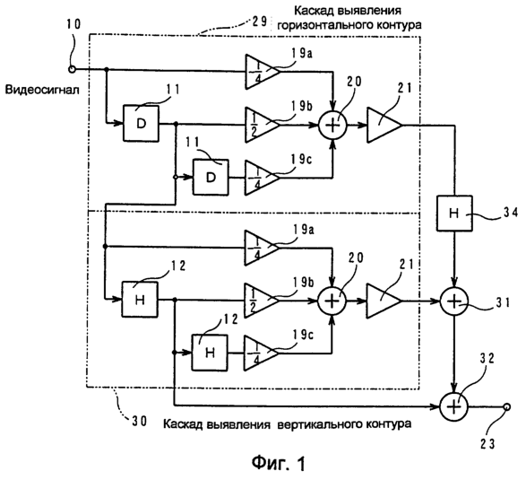 Каскад 29 выявления горизонтального контура содержит фильтр 19а выявления контура, непосредственно соединенный с входной клеммой 10 видеосигнала, фильтр 19b выявления контура, соединенный с той же входной клеммой 10 через 1 схему 11 задержки на 1 точку растра, фильтр 19с выявления контура, соединенный с той же входной клеммой 10 через 2 схемы 11 задержки на 1 точку, схему 20 суммирования для выдачи суммы выходных сигналов из фильтров 19а, 19Ь, 19с выявления контура, схему 21 умножения коэффициента для умножения заранее определенного коэффициента К1 и схему 34 задержки на 1 строку, соединенную со схемой 21 умножения коэффициента. Более конкретно составляющие горизонтального контура выявляются из исходного пиксела (элемента изображения) и пиксела, предшествующего на 1 точку, и пиксела, непосредственно следующего за исходным пикселом. Схема 34 задержки служит для синхронизации выходного сигнала каскада 30 выявления вертикального контура.