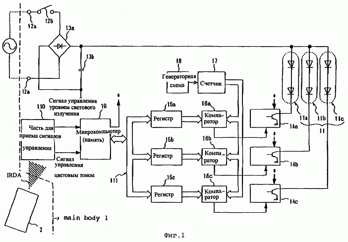 Микрокомпьютер 19 основного корпуса 1 индивидуально обрабатывает полученный сигнал IRDA как сигнал управления световым излучением и сигнал управления цветовым тоном.
