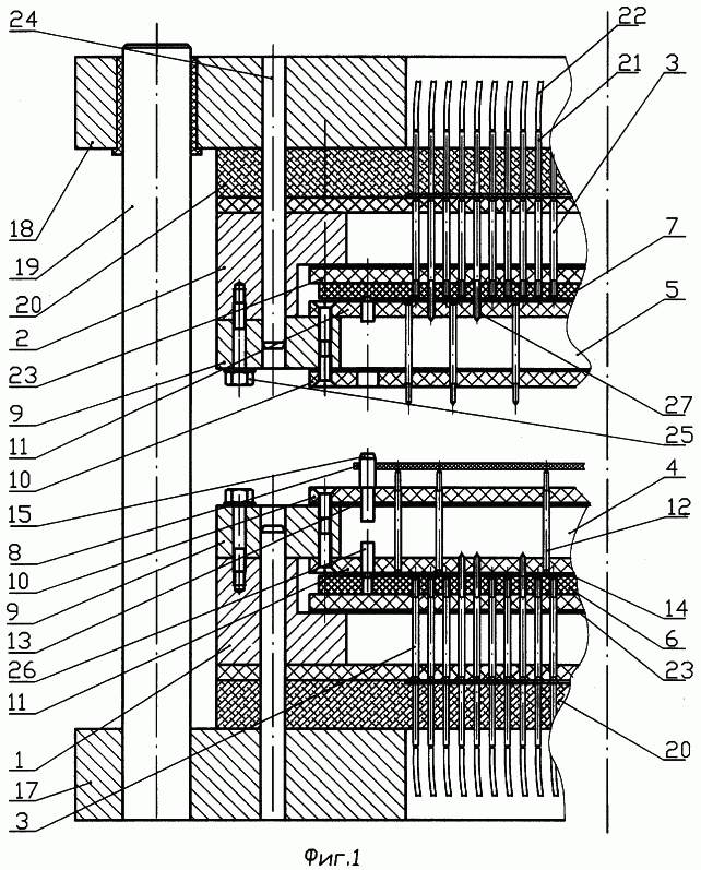 Нижняя 1 контактная матрица с подпружиненными контактами 3 размещена на нижнем неподвижном основании 17. Верхняя 2 контактная матрица с подпружиненными контактами 3, размещена на верхнем подвижном основании 18. Перемещение верхнего подвижного основания 18 относительно нижнего неподвижного основания 17 осуществляется по двум направляющим колонкам 19, запрессованным в нижнем неподвижном основании 17. Каждая нижняя 1 и верхняя 2 контактная матрица содержит изоляционное основание регулярного контактного поля 20 с запрессованными в нем гильзами 21 с подключенными к ним проводами 22 для соединения с измерительным блоком, при этом гильзы 21 расположены во всех узлах выбранной координатной сетки, например в узлах координатной сетки с шагом 2,5 мм, а также каждая нижняя 1 и верхняя 2 контактная матрица содержит диэлектрическую панель 23, в отверстиях которой размещены подпружиненные контакты 3, соответственно установленные в гильзы 21, и штифты 24, служащие для точного совмещения контактов 3 регулярного поля 20 и контактного поля адаптера 4, 5. На каждой нижней 1 и верхней 2 контактной матрице со стороны соответствующих сменных адаптеров 4, 5 размещен ограничитель прогиба платы сопряжения 6, 7, устанавливаемый в свободном пространстве от подпружиненных контактов 3 регулярного поля контактной матрицы 1, 2. Нижний 4 и верхний 5 сменные адаптеры прижимаются к соответствующим контактным матрицам 1, 2 при помощи крепежных болтов 25. Подпружиненные контакты 12 сменных адаптеров 4, 5 размещены в соответствующих отверстиях первой 10 и второй 11 направляющих панелей, удерживающих их в горизонтальной плоскости контактного поля. Первая 10 и вторая 11 направляющие панели выполнены из диэлектрического материала. Диаметры отверстий в первой 10 и второй 11 направляющих панелях сменного адаптера 4, 5 позволяют перемещаться подпружиненным контактам 12 вдоль вертикальной оси контактного поля. Эластичная направляющая панель 13, прилегающая к первой направляющей панели с внутренней стороны, удерживает контакты 12 от выпадения, при этом диаметры отверстий в эластичной направляющей панели 13, ее толщина и материал выбраны таким образом, чтобы образовался натяг, препятствующий перемещению подпружиненных контактов 12 под действием собственного веса по вертикальной оси контактного поля и исключающий люфт в горизонтальной плоскости в пределах зазора между контактами 12 и стенками отверстий в первой 10 направляющей панели сменного адаптера 4, 5 и, в то же время, не исключающий перемещение подпружиненных контактов 12 при приложении усилий вдоль оси контактов в момент контактирования с контролируемой платой 8. Плата сопряжения 14, выполненная в виде многослойной печатной платы, установлена на фиксирующих штифтах 26 второй направляющей панели 11 на стороне, обращенной к регулярному полю контактной матрицы 1, 2 и обеспечивает подключение адаптера 4, 5 с одной стороны к соответствующей контактной матрице 1, 2 с подпружиненными контактами 12, с другой стороны через установленные в адаптере 4, 5 подпружиненные контакты 12 к произвольно размещенным контактным площадкам контролируемой МПП 8 с плотностью их размещения, значительно превышающей плотность размещения подпружиненных контактов регулярного поля контактной матрицы 1, 2, или подключение к произвольно размещенным контактным площадкам к