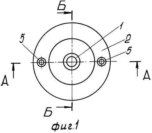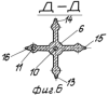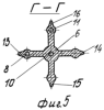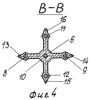 На фиг.4 – сечение В-В на фиг.3, горизонтальное сечение ребер пористого корпуса с пятью выходными отверстиями.