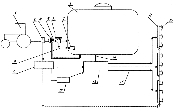 На чертеже представлен штанговый опрыскиватель. Штанговый опрыскиватель содержит энергетическое средство 1, с приводом 2 (ВОМ энергетического средства). От привода 2 приводится в работу система гидроперемешивания рабочей жидкости в резервуаре 3. Система гидроперемешивания включает гидронасос 4, который соединен трубопроводом 5 с резервуаром 3 и трубопроводом 6 с гидромешалкой 7. Система гидроперемешивания снабжена регулятором давления 8. Привод 2 энергетического средства 1 взаимодействует с генератором 9, который питает электроэнергией двигатели, установленные на каждом распыляющем рабочем органе 10, закрепленном на штанге 11. Распыляющие рабочие органы 10 выполнены в виде дисковых распылителей. Одновременно генератор 9 питает электроэнергией насос-дозатор 12 и блок управления 13 насоса-дозатора 12, который посредством трубопровода 14 соединен с резервуаром, а через трубопроводы 15 подает рабочую жидкость к каждому рабочему органу 10. Блок управления 13 выполнен с возможностью регулирования нормы расхода рабочей жидкости в зависимости от скорости движения энергетического средства, а также отключения и включения дисковых распыляющих рабочих органов в конце и начале гона поля.