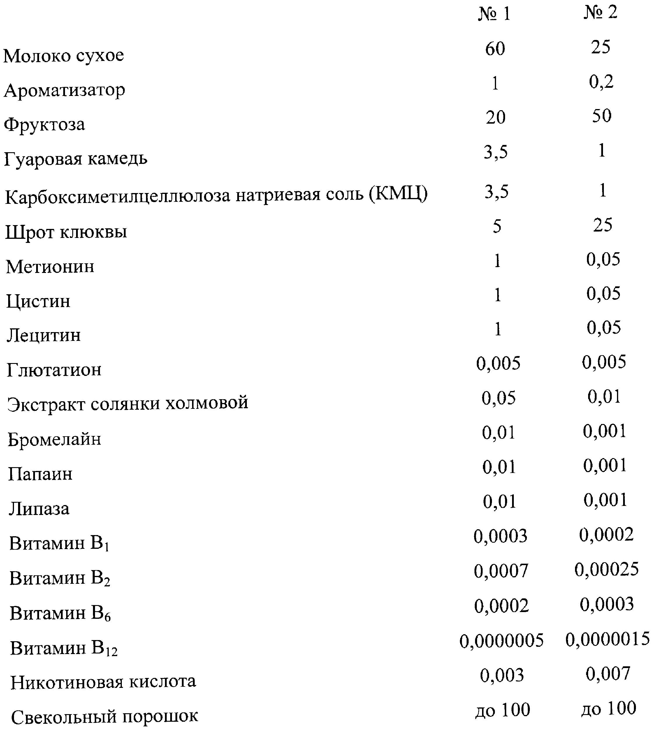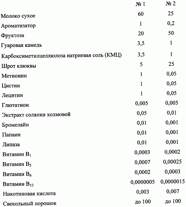 1. Молочный десерт, содержащий сухое молоко и ароматизатор, отличающийся тем, что дополнительно содержит фруктозу, гуаровую камедь, натриевую соль карбоксиметилцеллюлозы и овощной концентрат при следующем содержании компонентов, мас.%: Молоко сухое 25-60 Ароматизатор 0,2-1 Фруктоза 10-50 Гуаровая камедь 1-3,5 Натриевая соль карбоксиметилцеллюлозы 1-3,5 Овощной концентрат Остальное 2. Молочный десерт по п.1, отличающийся тем, что в качестве овощного концентрата содержит морковный порошок и дополнительно содержит лимонную кислоту в количестве (0,5-2,5)% от общей массы компонентов. 3. Молочный десерт по п.2, отличающийся тем, что дополнительно содержит таурин в количестве (0,1-1,0)% от общей массы; (0,05-0,10)% лецитина; (0,005-0,05)% бета-каротина; (0,005-0,02)% окиси цинка; (0,00001-0,0005)% селенита натрия, (0,01-0,05)% глютаминовой кислоты и (0,01-0,03)% цистеина от общей массы компонентов. 4. Молочный десерт по п.1, отличающийся тем, что в качестве овощного концентрата используют свекольный порошок. 5. Молочный десерт по п.4, отличающийся тем, что дополнительно содержит (5-35)% шрота клюквы, (0,05-1,0)% метионина, (0,05-1,0)% цистина, (0,05-1,0)% лецитина, (0,001-0,005)% глютатиона, (0,01-0,05)% экстракта солянки холмовой, (0,01-0,01)% бромелайна, (0,001-0,01)% папаина, (0,001-0,01)% липазы, (0,00025-0,0003)% витамина B1, (0,00025-0,0007)% витамина В2, (0,002-0,003)% витамина В6, (0,0000005-0,0000015)% и (0,003-0,007)% никотиновой кислоты от общей массы компонентов.