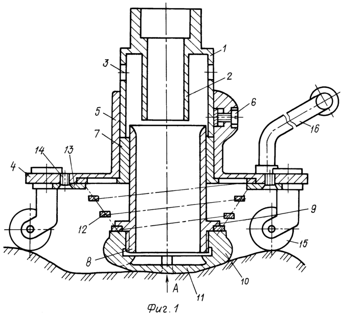 С нижней стороны платформы 4 имеется удерживающая трубчатый элемент 8 спиральная коническая пружина 12, верхнее торцевое кольцо которой прижато к поверхности платформы с помощью планок 13 и закреплено винтами 14, а нижнее кольцо пружины 12 зажато между фланцем 9 элемента 8 и верхним торцом насадки 10. Для обеспечения возможности перемещения платформы 4 с установленными на ней корпусом 1 насадка и подвижным трубчатым элементом 8 по ровной или сложнорельефной поверхности платформа снабжена опорными элементами в виде самоустанавливающихся поворотных роликов 15. Перемещение платформы осуществляют с помощью ручки 16.