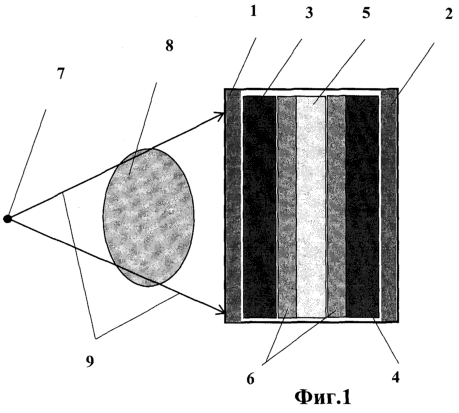 Заявляемая кассета работает следующим образом. Падающее из фокуса рентгеновской трубки 7 рентгеновское излучение 9 проходит через обследуемый объект 8 и засвечивает кассету. При этом низкоэнергетическая часть рентгеновского излучения 9 поглощается синечувствительным экраном 3, где преобразуется в синий свет оптического диапазона, который засвечивает передний эмульсионный слой 6. Более высокоэнергетическая часть рентгеновского излучения 9 доходит до зеленочувствительного экрана 4, где преобразуется в зеленый свет оптического диапазона, который засвечивает задний эмульсионный слой 6. Этим достигается линейная зависимость усиливающего действия экранов в зависимости от энергии рентгеновского излучения.