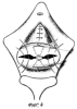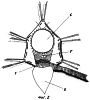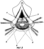 Пластическую обработку оставшейся культи производят по Штурмдорфу; принцип этой обработки состоит в соединении слизистой шейки со слизистой влагалища таким образом, чтобы раневая поверхность культи была покрыта слизистой влагалища. Иглу с толстым кетгутом вкалывают в переднюю стенку слизистой влагалища на расстоянии 2 см от края и см влево от срединной линии в шеечный канал. Затем этой иглой захватывают слизистую влагалища на расстоянии 0,5 см от края, вкалывают ее вправо от срединной линии, но только в обратном направлении, сначала из шеечного канала через стенку шейки и выкалывают ее на расстоянии 0,5 см вправо от срединной линии, симметрично со вколом влево. При завязывании втягивают свободный край слизистой влагалища в шеечный канал. То же самое производят на задней стенке влагалища. С обеих сторон поперечные разрезы слизистой влагалища прошивают глубоким захватом клиновидно удаленной части шейки матки двумя узловыми швами (фиг.4).