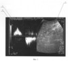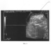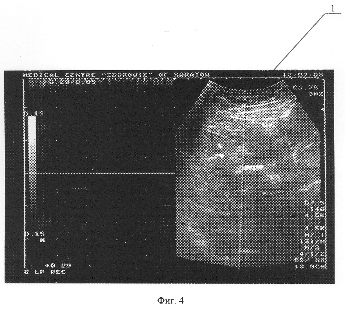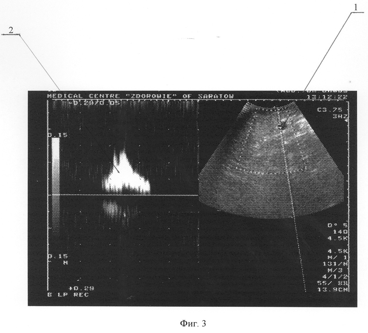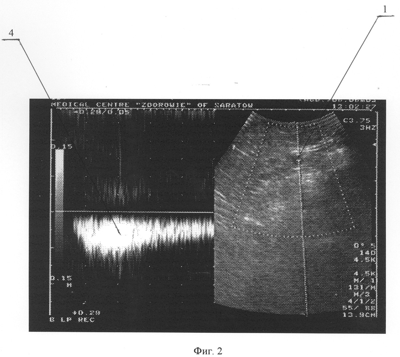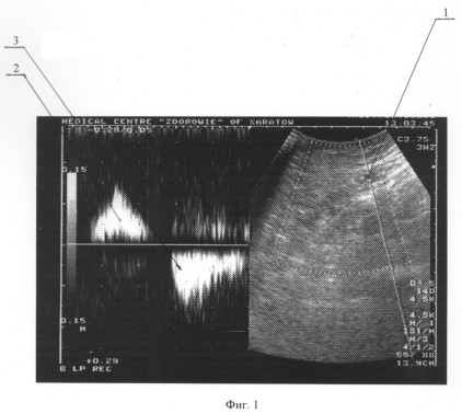 Больному выполнена операция – стволовая катетерная склеротерапия большой подкожной вены на правой голени до уровня коленного сустава. Описание операции: под местной анестезией разрезом длиной 1 см кпереди от медиальной лодыжки выделен начальный отдел большой подкожной вены, вена пересечена, дистальный конец перевязан, в проксимальный конец заведен катетер до уровня коленного сустава. После форсированного введения по катетеру изотонического раствора хлорида натрия и с помощью интраоперационного ультразвукового дуплексного ангиосканирования констатировано интравенозное расположение катетера. После предварительного наложения марлевых валиков по ходу большой подкожной вены и бинтования конечности эластическим бинтом средней степени растяжимости при медленной обратной тракции катетера по нему введено 4 мл 1% раствора фибро-вейна. Рана послойно ушита. Продолжительность операции составила 20 минут. Сразу после операции больной непрерывно ходил в течение 2 часов. Приступил к работе на второй день. Контрольное ультразвуковое дуплексное ангиосканирование произведено на 14 день после операции. Отмечена облитерация большой подкожной вены справа на голени. По стволу большой подкожной вены на бедре – признаки антеградного кровотока. Патологических венозных сбросов не выявлено. На фиг.3 и 4 представлены результаты ультразвукового дуплексного ангиосканирования большой подкожной вены в верхней трети бедра в ортостазе на 14 день после операции; на фиг.3 – во время проведения дистальной компрессионной пробы, на фиг.4 – во время выполнения пробы Вальсальвы, где 1 – просвет большой подкожной вены, 2 – антеградный кровоток по большой подкожной вене при компрессии икроножных мышц; ретроградного кровотока при декомпрессии икроножных мышц, а также при выполнении пробы Вальсальвы не отмечается.