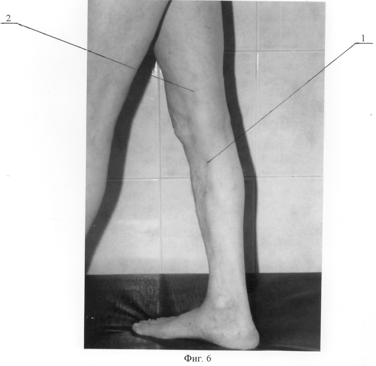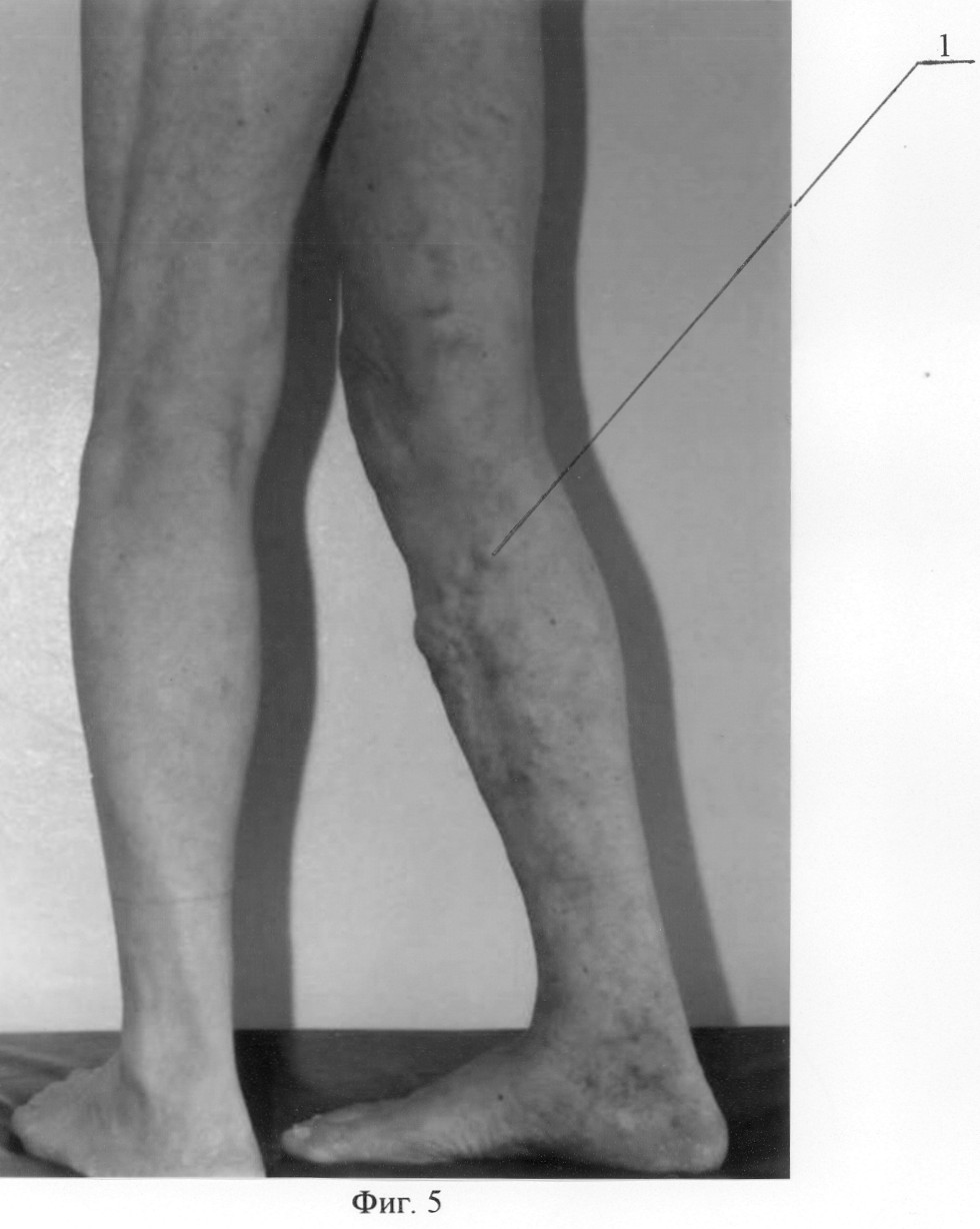 Осмотрен через 1 год. Жалоб не предъявляет. Признаков рецидива варикозной болезни не отмечено. Получен хороший косметический результат. При ультразвуковом дуплексном ангиосканировании признаков патологического сафено-феморального рефлюкса в горизонтальном и вертикальном положениях не выявлено. На фиг.5 изображено состояние правой нижней конечности пациента до лечения, где 1 -варикозно-трансформированная большая подкожная вена; на фиг.6 – состояние правой нижней конечности этого же пациента через 1 год после операции, где 1 – облитерированная на голени большая подкожная вена, 2 – сохраненный ствол большой подкожной вены на бедре.