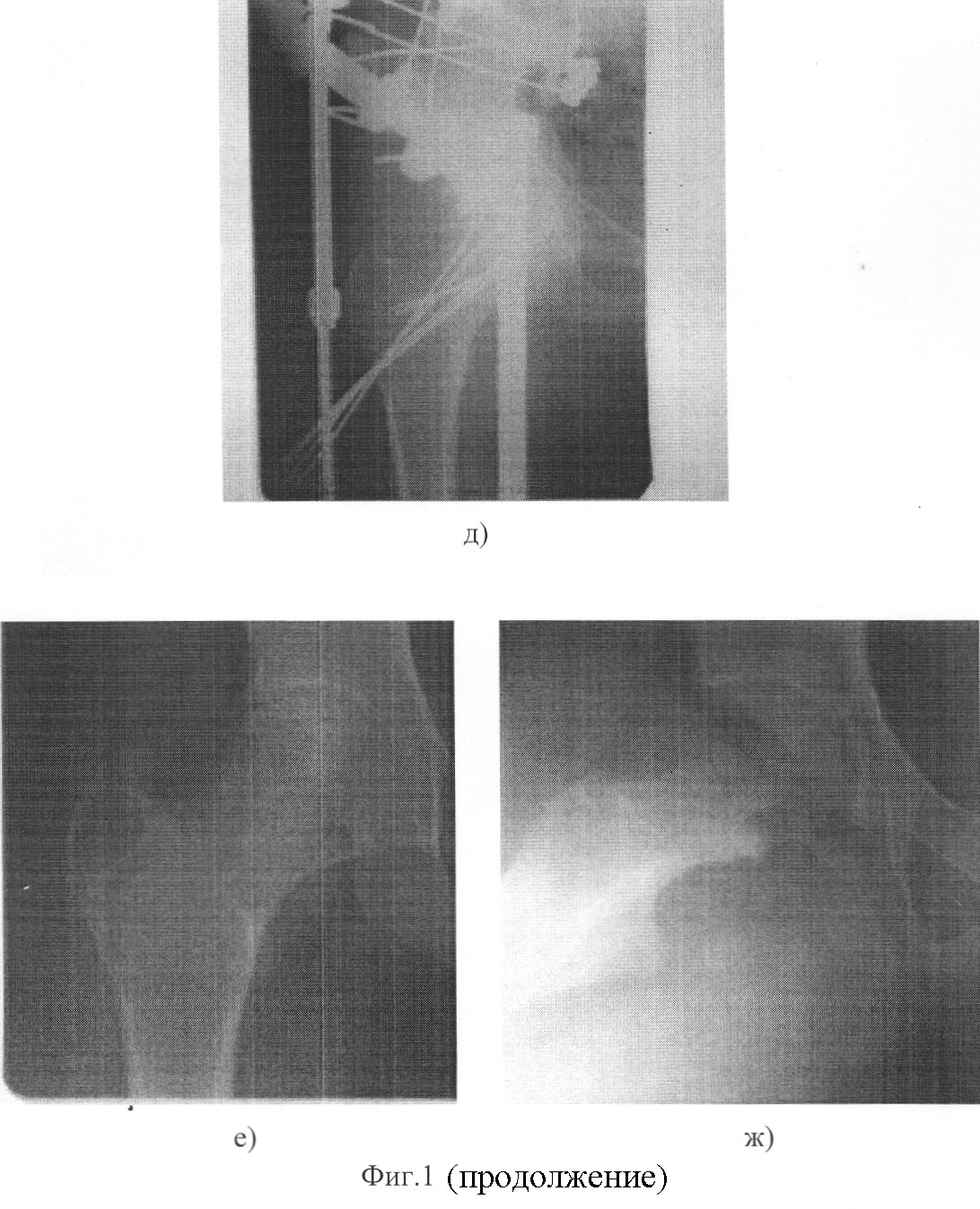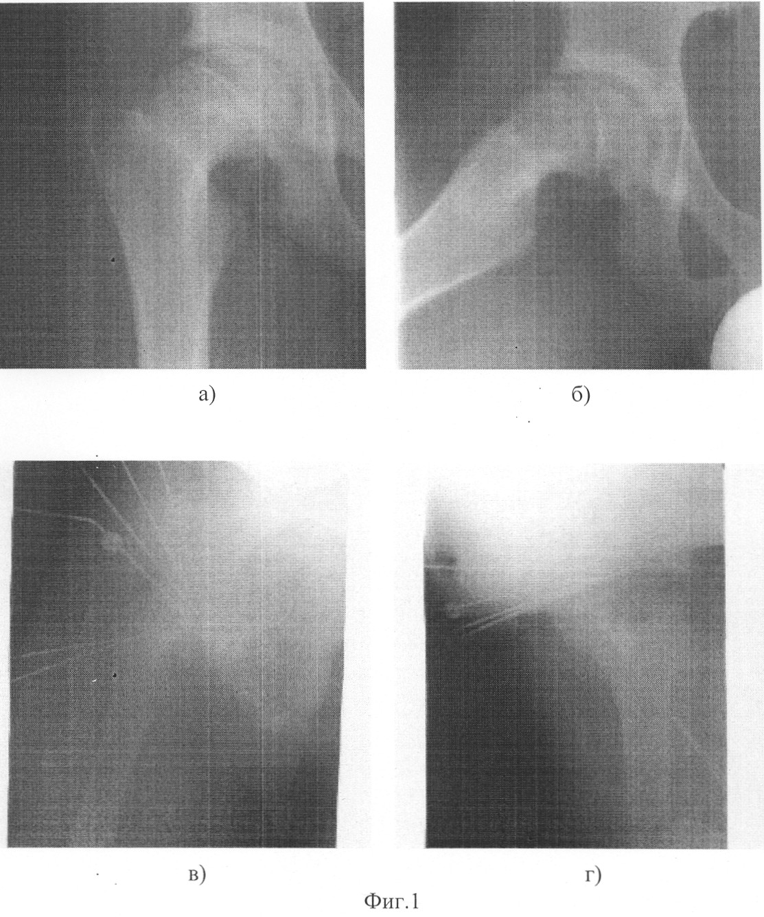 Вслед за этим осуществляют сопоставление шейки бедра с центрированным эпифизом. Для этого, с учетом величины смещения, бедро сгибают, ротируют кнутри и отводят. Отрепонированные таким образом фрагменты бедра фиксируют пучком спиц, введенных в них по оси шейки в головку. После рентгенконтроля ранее введенные чрезацетабулярно спицы удаляют, придают бедру положение нормокоррекции и по известной методике с помощью аппарата внешней фиксации выполняют остеосинтез подвздошной и бедренной костей с созданием условий разгрузки в тазобедренном суставе.