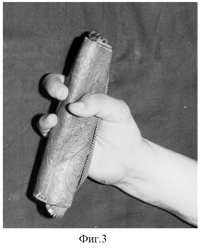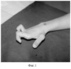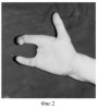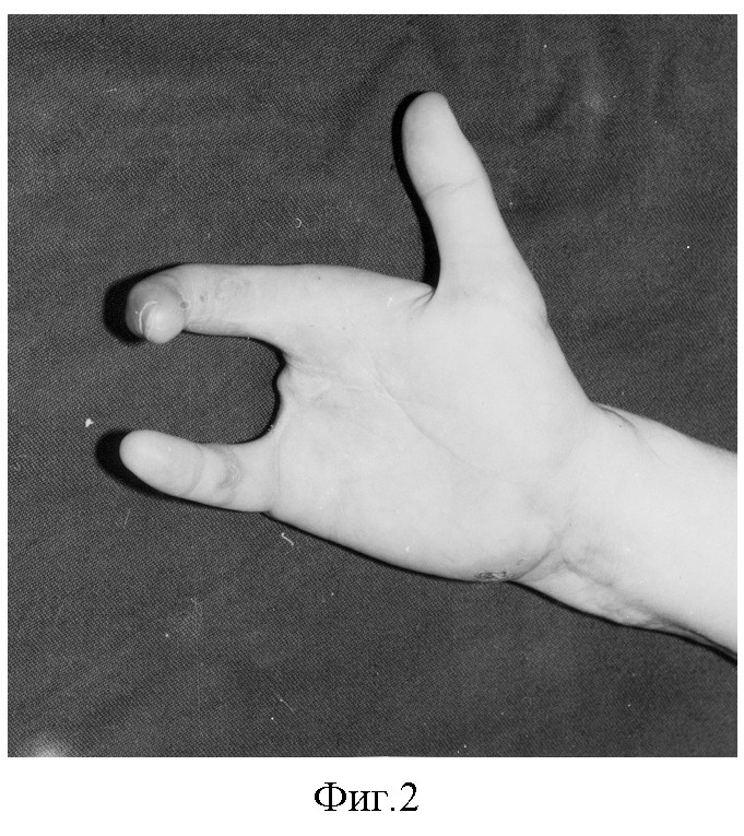 12.11.98 г. в отделении кисти НИЦТ “ВТО” произведена операция по вышеописанной методике. Основные фаланги 2 и 5 пальцев правой кисти были установлены в функциональное положение по отношению к одноименным пястным костям под углом 100°. Через основания основных фаланг к головкам пястных костей проведены по две перекрещивающиеся спицы. Через 4 дня после исчезновения отека и болей начаты активные движения в межфаланговых суставах оперированных пальцев правой кисти. После наступления фиброзного анкилоза (через 2 месяца после операции) – спицы удалены. Контрольный осмотр через 4 года: хватательная функция 2 и 5 пальцев правой кисти восстановлена (фиг.2, 3).