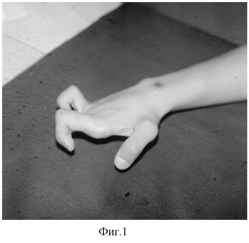Больной Ф-в 1981 г.р., история болезни №1247. Из анамнеза: 23.02.97 г. случайно схватился за оголенный электропровод напряжением 380 V и получил поражение 3-4 пальцев правой кисти и локтевого нерва на уровне нижней 1/3 правого предплечья. На следующий день в районной больнице произведена некроэктомия 3-4 пп. правой кисти, восстановление локтевого нерва не производилось. В последующем, в связи с параличом локтевого нерва, развилась сгибательная контрактура в межфаланговых суставах оставшихся 2 и 5 пальцах, и разгибательная контрактура в пястно-фаланговых суставах с рекурвацией основных фаланг 2 и 5 пальцев правой кисти (фиг.1).