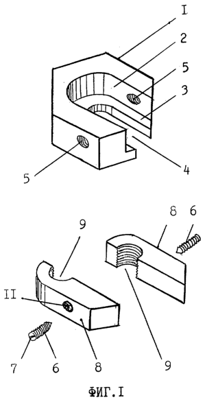 1. Устройство для перекусывания резьбовых стержней в виде гайки с шестигранным основанием, отличающееся тем, что выполнено парным и содержит вкладыши и винты, при этом в основании выполнено ложе под вкладыши, открытое в сторону одного из ребер гайки, в дне ложа имеется паз, открытый в ту же сторону, в стенках гайки, перпендикулярно оси паза выполнены сквозные, соосно расположенные резьбовые отверстия под безголовчатые винты, имеющие заостренные концы и оснащенные шлицами, вкладыши выполнены в виде брусов четырехугольного сечения, причем наружное основание каждого бруса скошено, а внутреннее основание закруглено по форме ложа, у закругленных оснований и концентрично с ними выполнены оснащенные резьбой полуцилиндрические выемки, которые, при смыкании вкладышей длинными внутренними гранями, образуют резьбовое отверстие под перекусываемый резьбовой стержень, а на наружных гранях вкладышей выполнены конические углубления под заостренные концы безголовчатых винтов.