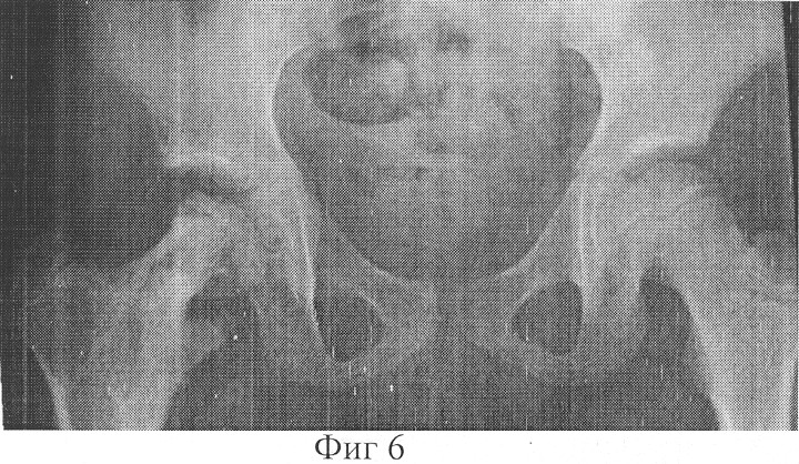 Больной проведено оперативное вмешательство. В операционной под внутривенным наркозом через крыло подвздошной кости проведено 4 спицы, которые фиксированы в дуге и натянуты. Через дистальный метафиз бедра проведено 3 спицы, которые фиксированы в 3/4 кольца и натянуты. На границе верхней трети и средней трети бедра в сагиттальной плоскости проведены две перекрещивающиеся спицы с упорными площадками, фиксированы в дуге, которая соединена с опорой на дистальном метафизе бедра с помощью стержней. Бедро установлено в положение отведения 30°, разгибания 180° и внутренней ротации 40°. Через дистальный отдел шейки в сагиттальной плоскости проведены две перекрещивающиеся под углом 15° спицы с упорными площадками навстречу друг другу, которые фиксированы в дуговой опоре и натянуты. Опору соединили с дугой на подвздошной кости стержнями Через разрез 4 см по передней поверхности бедра в вертельной области произведена С-образную остеотомия бедра от верхне-наружнего края шейки до верхнего края малого вертела. Дистальный отдел бедренной кости приведен на 30° и ротирован внутрь на 25°. Опоры, установленные на шейке бедра и на границе верхней и средней трети бедра соединены стержнями с шарнирными устройствами. Стержни установлены в направлении сверху вниз изнутри кнаружи перпендикулярно линии, касательной к плоскости входа во впадину. Наложены швы на рану. С шестого дня в течение 48 суток производили дистракцию в зоне остеотомии 0,5 мм в сутки (Фиг.4). После окончания дистракции в операционной под наркозом через через вертельную область, зону удлинения, шейку и головку бедра проведены 6 спиц, свободные концы которых фиксированы к опоре, расположенной на границе верхней трети и средней трети бедра (Фиг.5). Удалены спицы, проходившие через шейку бедренной кости. Продолжительность фиксации фрагментов бедренной кости в корригированном состоянии 90 дней. После демонтажа аппарата и удаления спиц проведен курс восстановительного лечения.
