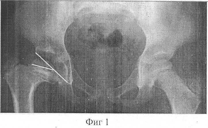 Опоры, установленные на шейке бедра и на границе верхней и средней трети бедра, соединяют стержнями с шарнирными устройствами. Стержни устанавливают в направлении сверху вниз изнутри кнаружи перпендикулярно линии, касательной к плоскости входа во впадину. Накладывают швы на рану. На 5-6 день начинают дистракцию в зоне остеотомии 0,5 мм в сутки. Величину удлинения контролируют с помощью рентгенографии, ориентируясь на длину шейки и расположение верхушки большого вертела относительно центра головки бедра (Фиг.3). После окончания удлинения производят дополнительное вмешательство. Под наркозом проводят не менее 4 спиц через вертельную область, зону удлинения, шейку и головку бедра. Свободные концы спиц фиксируют к опоре, расположенной в подвертельной области. Удаляют спицы, ранее проведенные через шейку бедра. Через 2,5-3 месяца после консолидации костных фрагментов в зоне остеотомии бедренной кости демонтируют аппарат, удаляют спицы и начинают разработку движений в тазобедренном суставе.