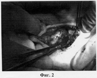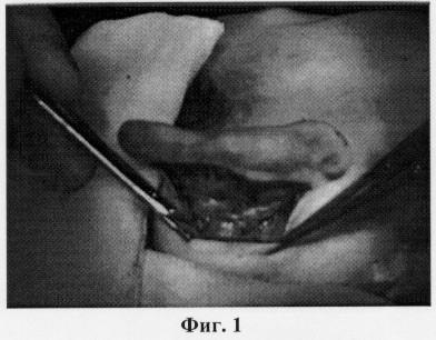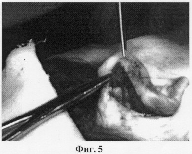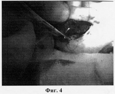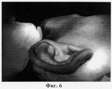 Операцию по коррекции формы ушных раковин выполняют под местной инфильтрационной анестезией. Проводят анестезию задней поверхности ушной раковины и области сосцевидного отростка. Затем на задней поверхности ушной раковины выполняют кожный разрез по краю завитка. Проводят тщательный гемостаз. Кожу по задней поверхности ушной раковины отслаивают до середины кривизны завитка, в нижней части от заушной мышцы и сосцевидного отростка приблизительно на 1 см, освобождая хрящ и выделяя заушную мышцу, что представлено на фиг.1. После этого иссекают заушную мышцу (фиг.2). После иссечения заушной мышцы выполняют наложение конхососцевидного шва, в который захватывают надкостницу сосцевидного отростка и хрящ ушной раковины (фиг.3), приближая ушную раковину к поверхности головы на необходимое расстояние. При этом хрящ прошивают на всю его толщину, нить проходит под кожей передней поверхности ушной раковины (фиг.4). Затем формируют противозавиток, накладывая сначала шов в области ножек противозавитка, затем в верхней его части, предотвращая нарушение контура противозавитка. Если хрящ имеет значительную упругость, то дополнительно накладывают 1-2 шва в средней части противозавитка (фиг.5). На фиг.6 представлен вид ушной раковины после наложения кожного шва.