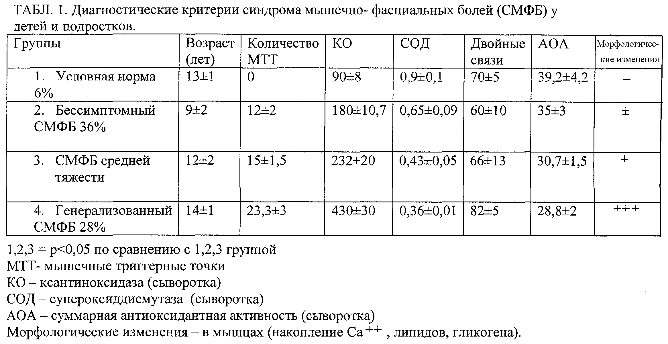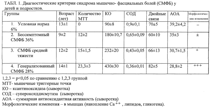 По данным обследования популяций детей 18-30% из них имеют генерализованный синдром мышечно-фасциальных болей с генетически обусловленным дефицитом биоэнергетического обмена, антиоксидантной системы защиты (табл.1) и нуждаются не только в соблюдении специального режима с дозированной физической нагрузкой, но и в рекомендациях по профориентации.