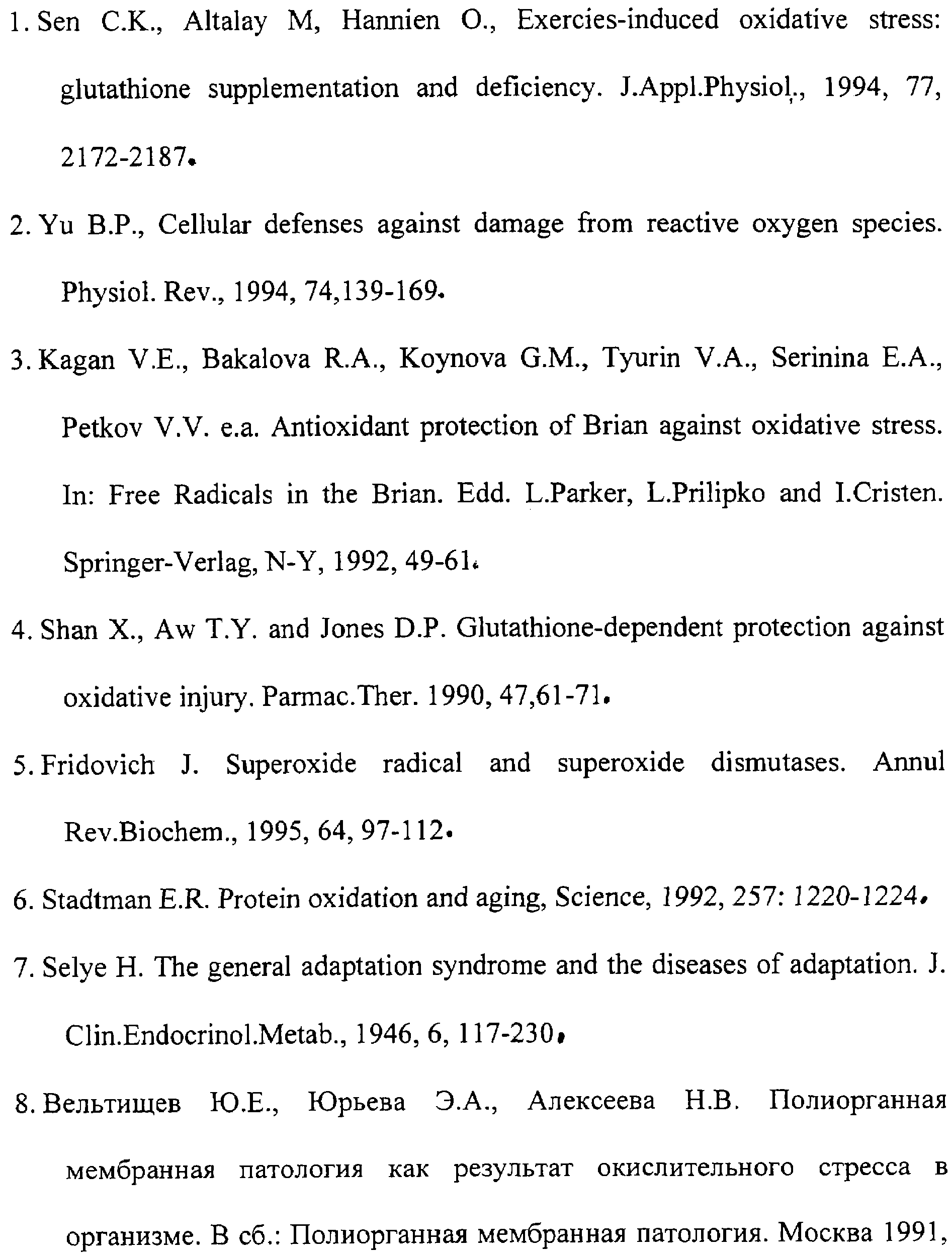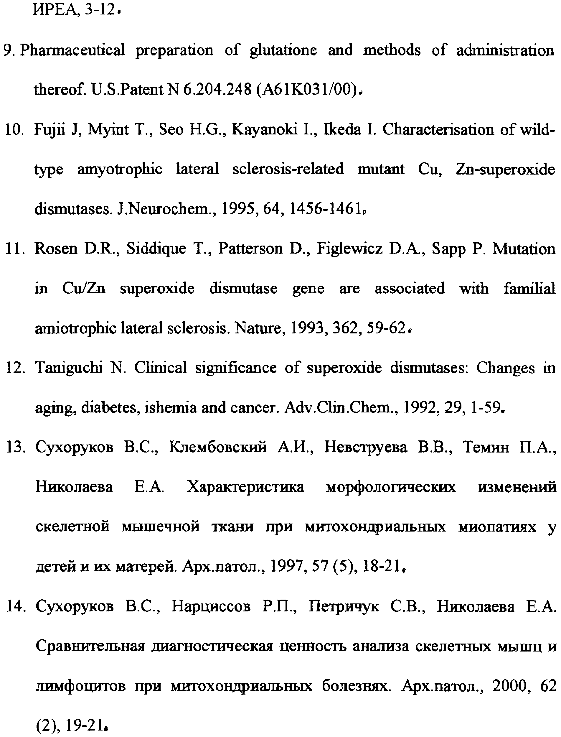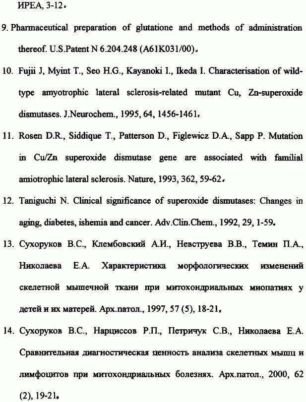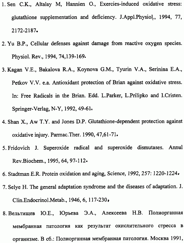 SELIE H. The general adaptation syndrome and the diseases of adaptation, Clin. Endocrinol. Metab., 1946, №6, 117-230. СУХОРУКОВ B.C. Характеристика морфологических изменений скелетной мышечной ткани при митохондриальных миопатиях у детей и их матерей. Арх. патологии, 1997, 57(5), 18-21. RU 2080090, C1, 27.05.1997.