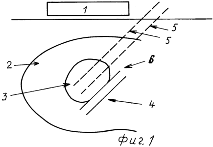 Способ осуществляют следующим образом: врач – оператор УЗ-датчиком 1 (фиг.1) визуализирует на экране печень 2 и очаг 3. Расположенный рядом сосуд 4 и очаг 3 позиционируют таким образом, чтобы предполагаемые биопсийные каналы 5 проходили параллельно сосуду, и канал катода проходил не ближе 10 мм от ближайшей стенки сосуда 6. Сначала под УЗ – контролем в очаг вводят две полые иглы, по которым проводят монополярные электроды 7 (фиг.2). Ближайший к сосуду электрод 7-К (катод) вводят параллельно сосуду и на расстояние не ближе 10 мм от стенки сосуда 6. Затем начинают ЭХЛ по стандартной методике. Включают прибор постоянного тока ECU-300 и устанавливают стандартные параметры работы, зависящие от размера метастаза (сила тока-80-100 мА, время лизиса 20-40 минут). Длину активной части монополярных электродов 7 устанавливают заранее равной 1/3 диаметра очага. При УЗ – мониторировании отмечают появление эхопозитивной зоны 8. Данная зона 8 постепенно увеличивается и достигает ближайшей стенки 6 сосуда 4. С этого времени врач – оператор начинает 20-минутный отсчет времени контакта зоны лизиса с передней стенкой 6 сосуда 4.После этого сеанс лизиса прекращают. Контакт ограничен 20 минутами для устойчивого девитализирующего действия ЭХЛ без разрушения стенки сосуда и возникновения кровотечения. Эхопозитивная зона должна иметь полный контакт с передней стенкой 6 протяженностью 9 не менее 1,3 диаметра очага 3 (с целью абластичности манипуляции). Это образование должно сохранять свои размеры не менее 24 часов после лизиса. Только в этом случае в зоне данного эхопозитивного образования имеется полный некроз тканей, что и является конечной целью ЭХЛ. При отсутствии этих признаков сеансы ЭХЛ повторяют до тех пор, пока весь объем метастаза не будет захвачен эхопозитивным образованием. Также в случае отсутствия адекватного соотношения времени контакта эхопозитивного образования (до 20 минут) и длины контакта образования и стенки сосуда протяженностью не менее 1,3 диаметра очага ЭХЛ следует повторить через 5-7 дней для достижения необходимого эффекта, так как полной гибели атипичных клеток достигнуть во время сеанса ЭХЛ не удалось.